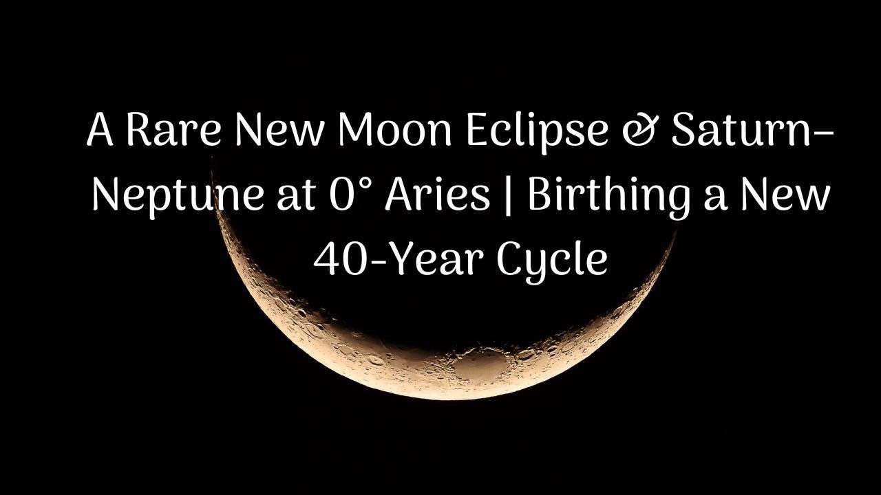 Everything is happening all at once. A new moon eclipse at the final degree of Aquarius signals the culmination of everything that sign represents: our hopes, our goals, our communities, our individuality, our innovation, even our relationship with technology. A new moon is always a birth, but this one carries unusual magnitude. It arrives alongside the long-awaited Saturn–Neptune conjunction at 0° Aries — a rare alignment that has not occurred in this position for thousands of years. This is not just a weekly shift. It is the conception of new structures that may guide us for decades to come.